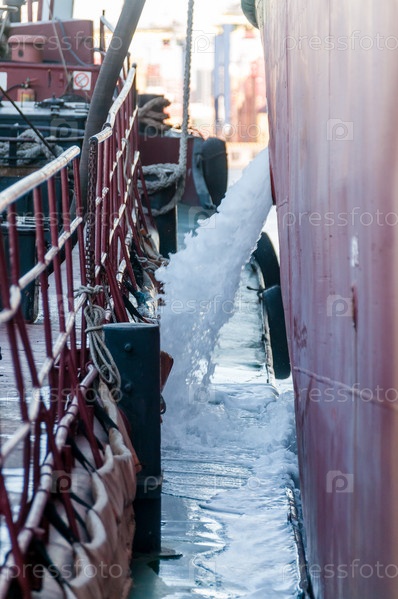 Россия, Санкт-Петербург, май 2021 г.: Сброс балластной воды на палубе нефтяного танкера в бухте порта