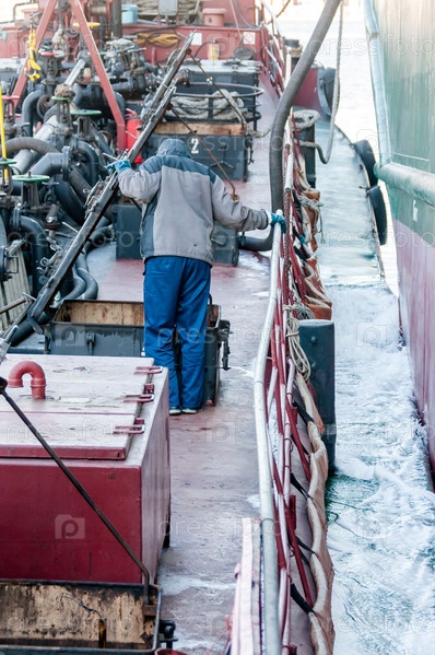 Россия, Санкт-Петербург, май 2021 г.: Рабочий в морской форме на палубе нефтяного танкера в бухте порта