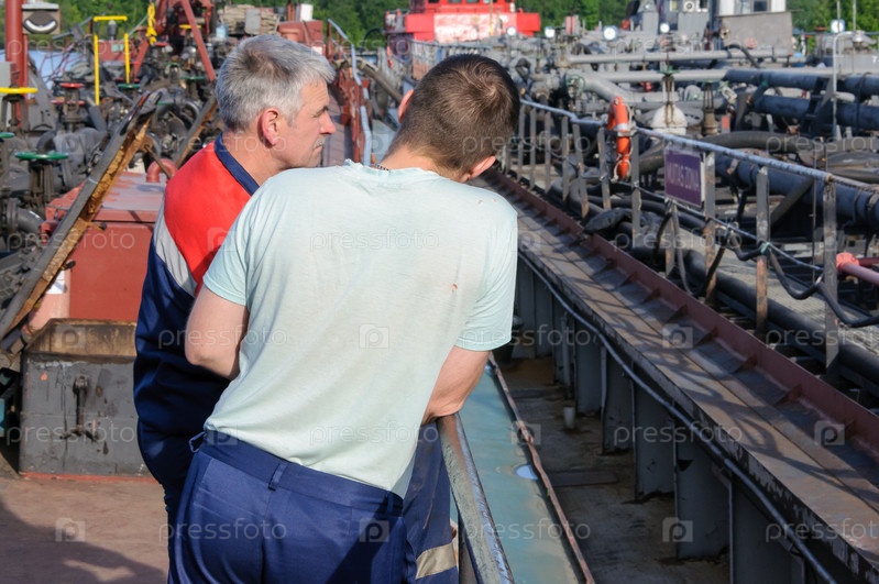 Россия, Санкт-Петербург, май 2021 г.: Два моряка-мужчины работают на палубе нефтяного танкера