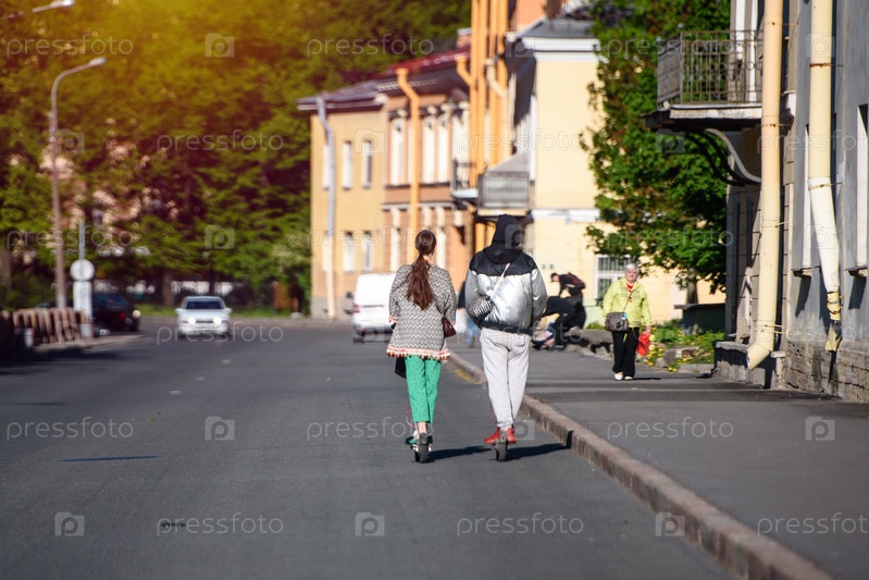 Россия, Санкт-Петербург, 30 мая 2020 года: пара на отдыхе катается на электросамокате по городу. Вид сзади