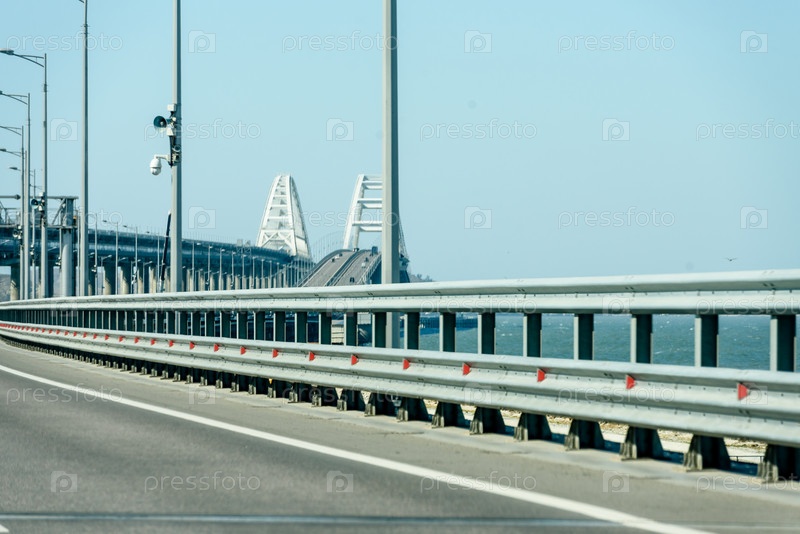 Россия, Крым, 11 сентября 2019 г.: Вид из окна машины. Крымский мост, новая железная дорога в Крыму. Крымновый, дорога