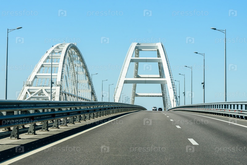Россия, Крым, 11 сентября 2019 г.: Дорога в Крым через Крымский мост. Вид из окна автомобиля