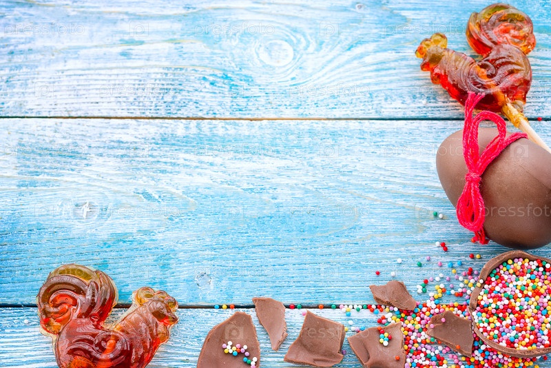 Пасхальный фон с шоколадными яйцами и сладостями на синем деревянном фоне. Копирование пространства