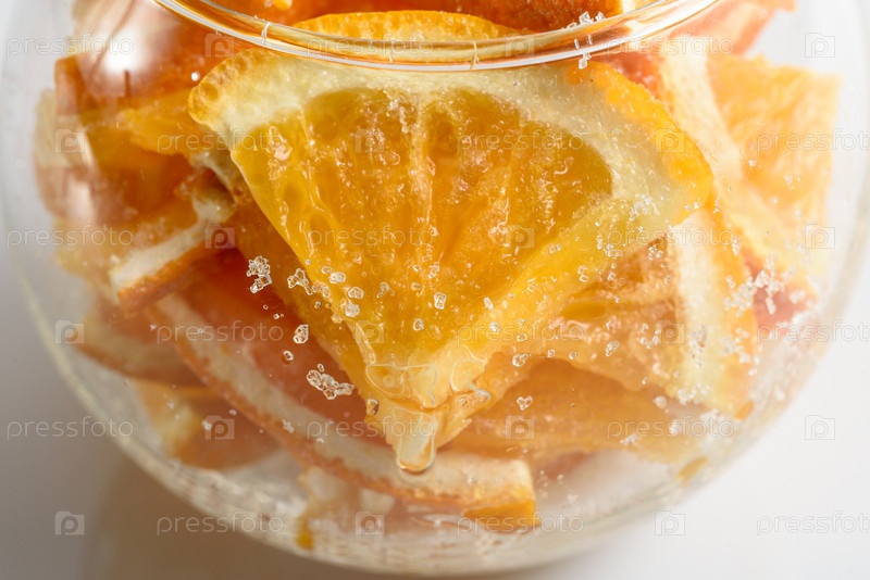 Ломтики апельсина в сахаре в стеклянной вазе. Вид сверху
