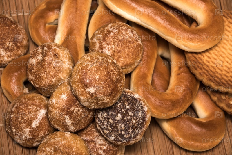 Медовый торт, бублики и печенье, крупный план