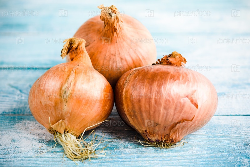 Три лука на синем деревянном фоне