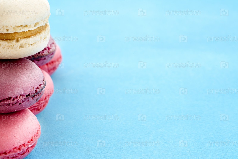 Французские макароны на синем фоне. Модный десерт. Сладкие пирожные