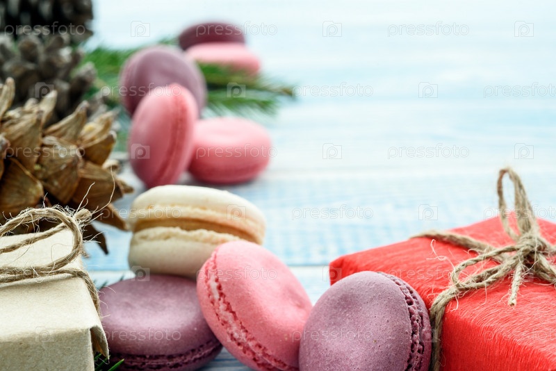 Сладкие макароны, подарки и еловые шишки на синем фоне. Рождественский фон. Новогодняя композиция