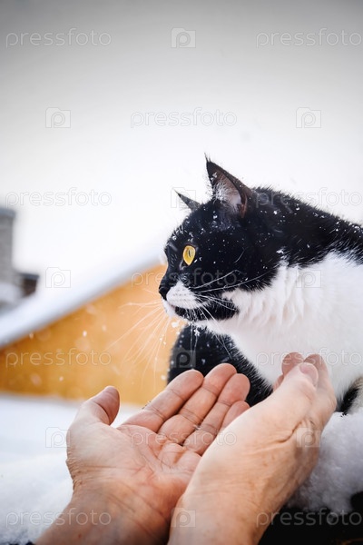 Человеческие руки тянутся к кошке, сидящей зимой на крыше. Помогите коту замерзнуть