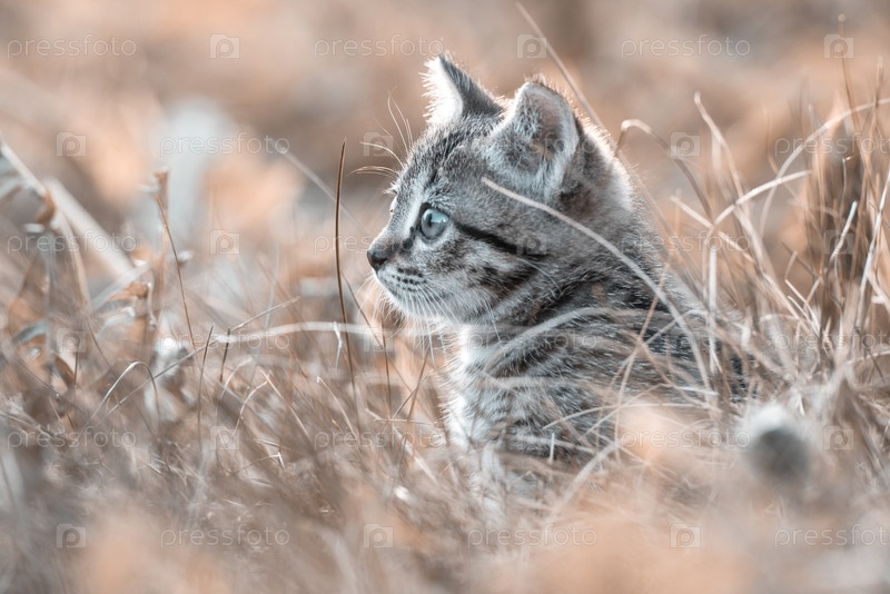 Удивленный котенок выглядывает из сухой травы