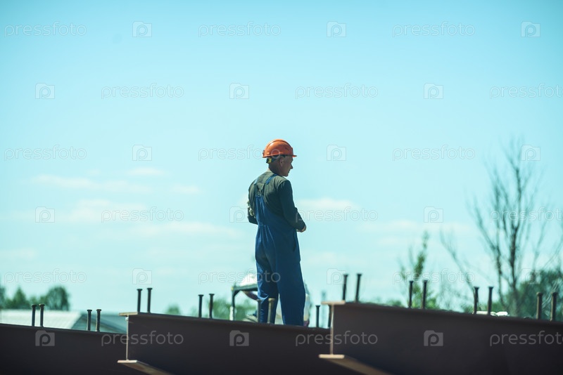 Россия, Санкт-Петербург, 23 июня 2020 года: дорожный рабочий в каске и комбинезоне. Строительство дорог и мостов в городе