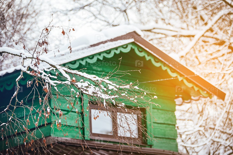 Вид на крышу зимой через заснеженные ветки