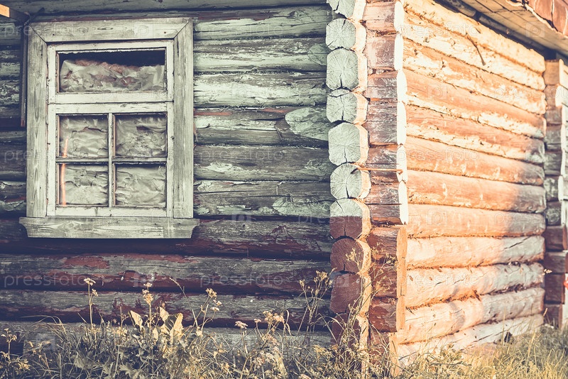 Старый деревянный дом, бревенчатые стены и окно - деревенская архитектура