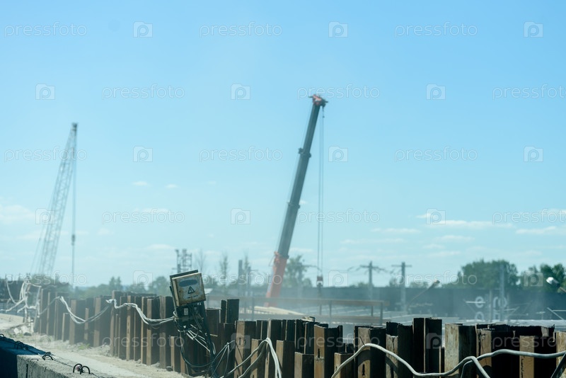 Подпорная стенка временной шпунтовой перемычки на строительной площадке. Россия, Санкт-Петербург, 23 июня 2020 г.: