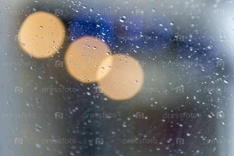Капли на стекле и сияющие городские огни — мягкий фон