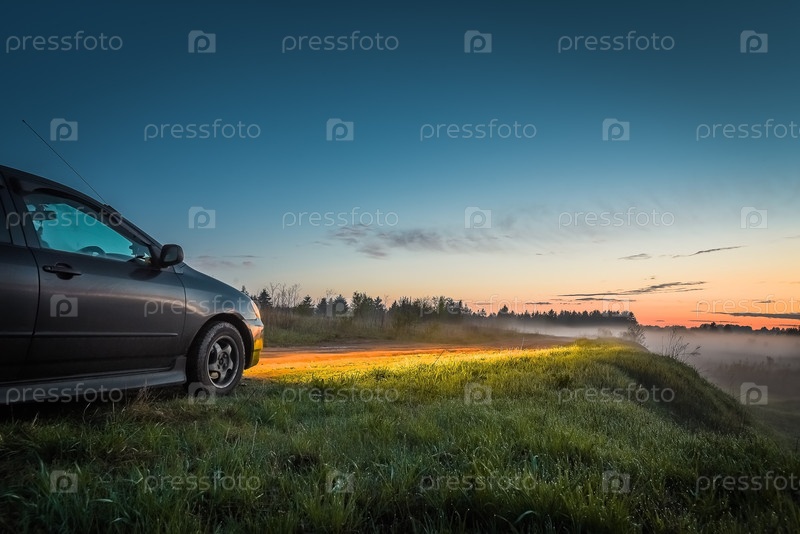 Автомобиль и свет фар на закате на открытом воздухе