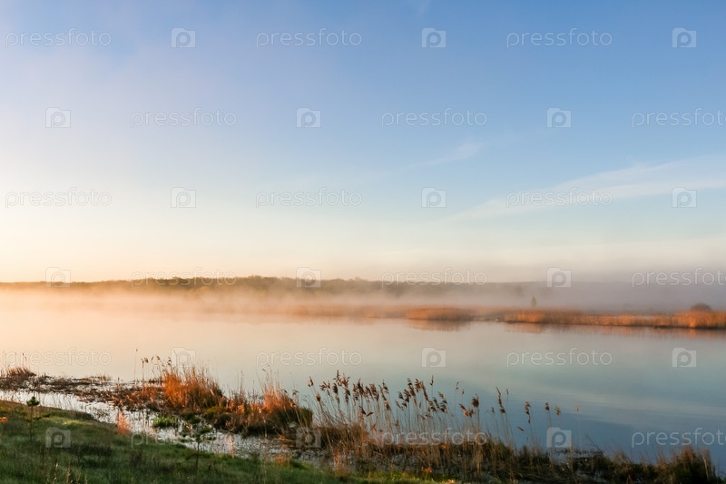 Красивый солнечный пейзаж с рекой, светит солнце