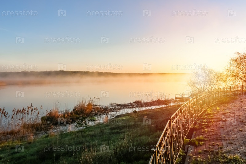 Красивый солнечный пейзаж с рекой, светит солнце