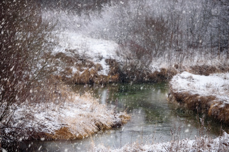 Зимний природный ландшафт - река во время снегопада