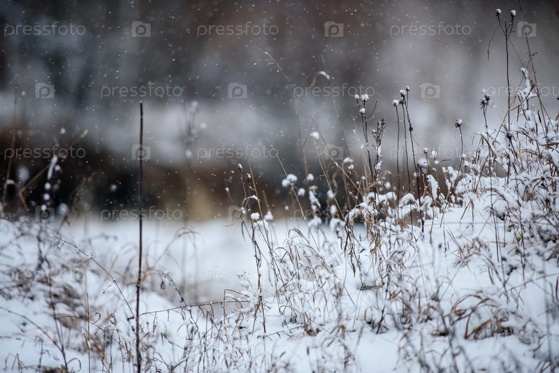 Сухая трава в поле и снегопад — концепция зимней погоды. Природный ландшафт
