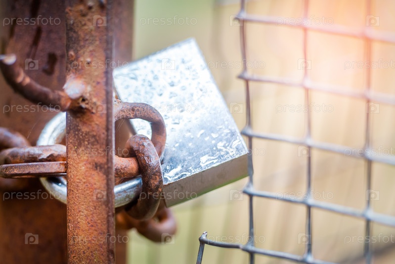 Замок на цепочке на воротах, идет дождь