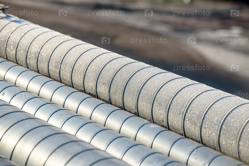 Трубы отопления грунта зимой крупным планом. Иней на тепловой трубке