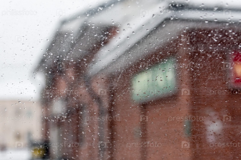 Вид на город через мокрое стекло, зимний пейзаж