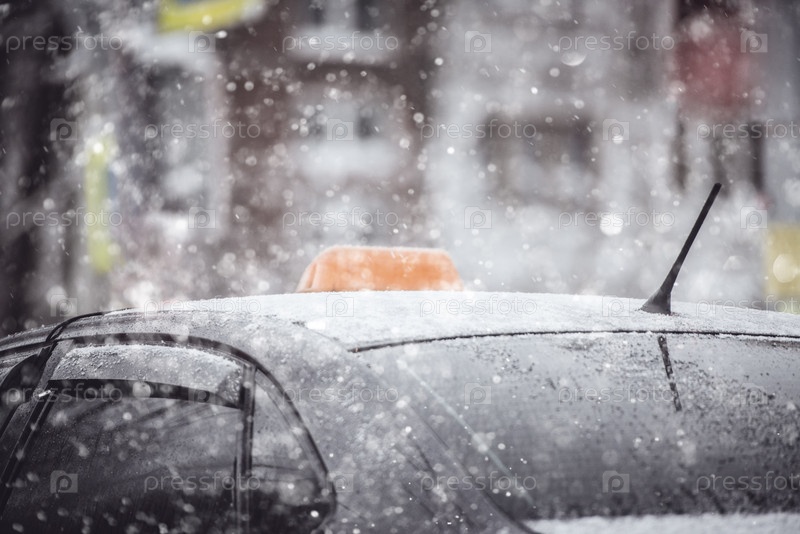 Крыша такси в снегу крупным планом в зимний день снегопада