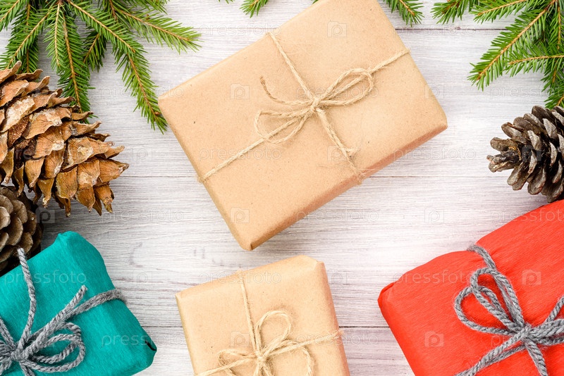 Рождественский фон - еловые ветки, шишки и подарки в упаковке из крафт-бумаги