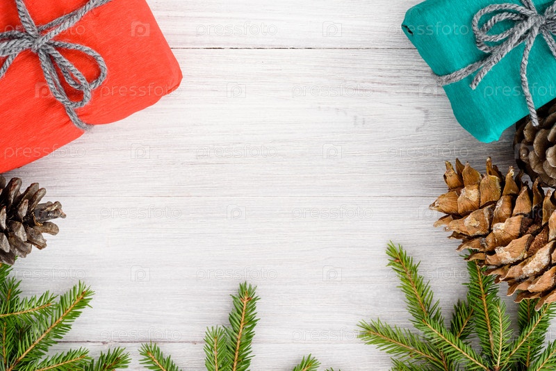 Рождественский фон - еловые ветки, шишки и подарки в упаковке из крафт-бумаги