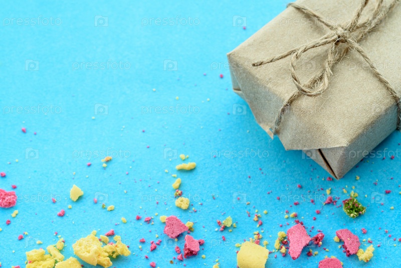 Синий фон с подарками и крошками разноцветного торта, т