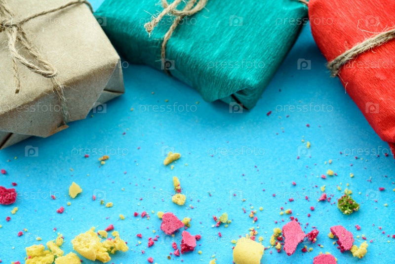 Синий фон с подарками и крошками разноцветного торта, т