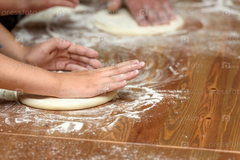 Крупный план детских рук, готовящих тесто для пиццы