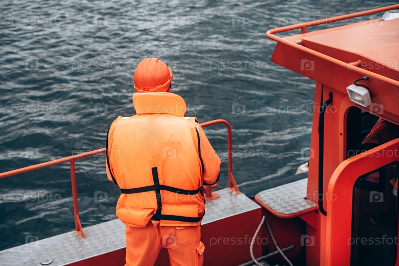 Спасательная служба и борьба со стихийными бедствиями на море. Спасатель в форме сзади на борту спасательной лодки