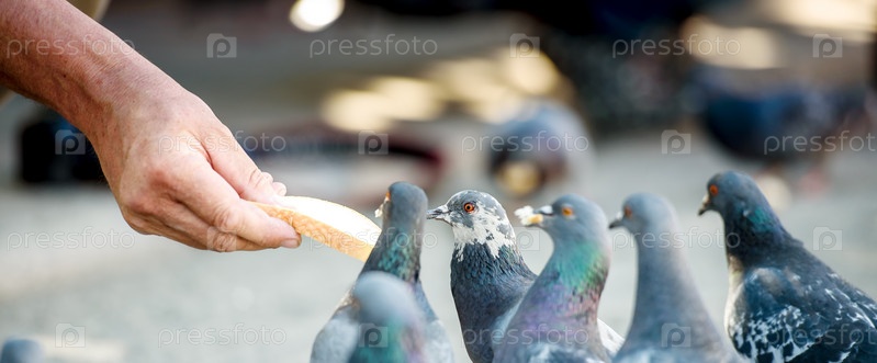 Городские голуби едят из рук человека. Крупным планом. Панорама