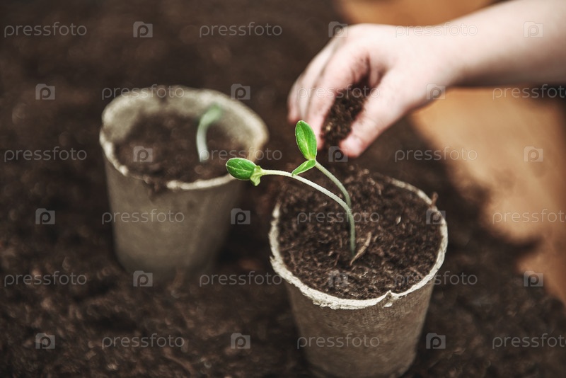 Руки маленького ребенка посеяли семена в торфяной горшок. Концепция Дня Земли и защиты растений. Торфяные горшочки для посадки