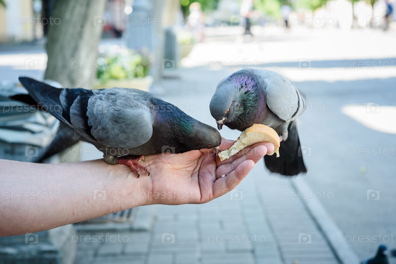 Городские голуби едят из рук человека
