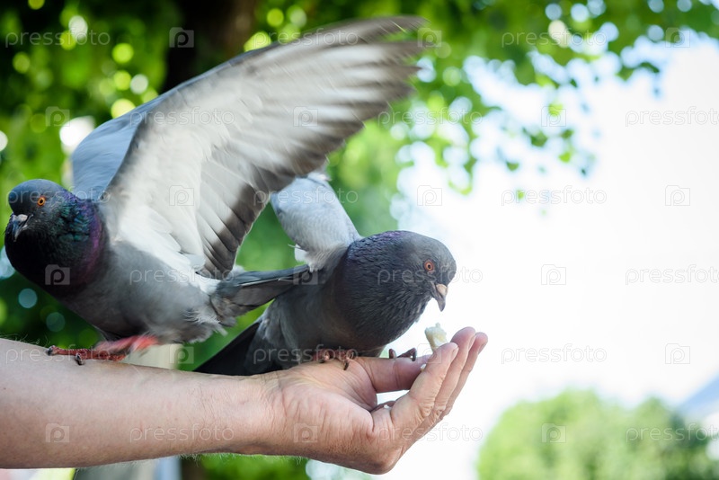 Городские голуби едят из рук человека
