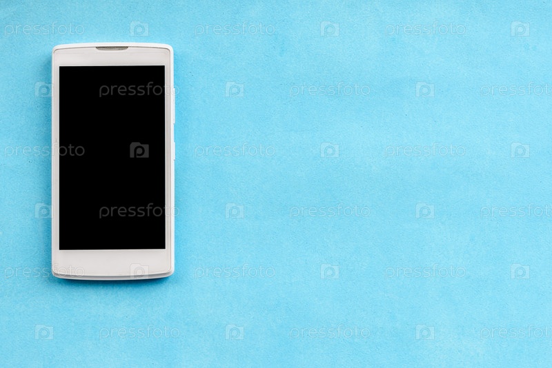 Вид сверху смартфона на синем фоне. Копировать пространство