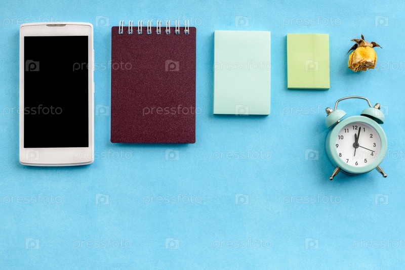 Вид сверху на макет с канцелярскими товарами и смартфоном