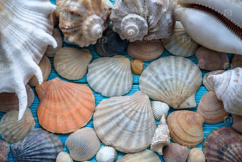 Фон морских ракушек на деревянном синем столе