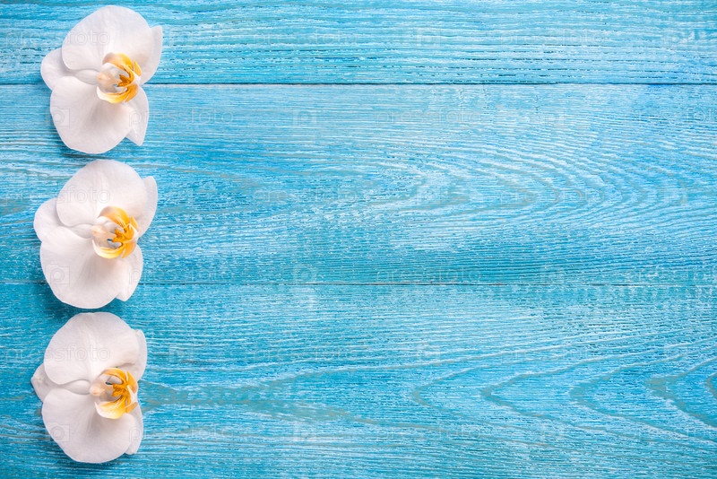 Белые цветы орхидеи на синем деревянном фоне, вид сверху, пространство для копирования
