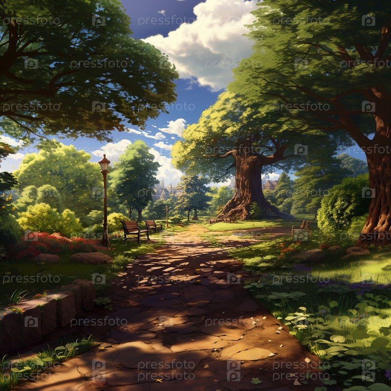Красивый летний парк в стиле аниме