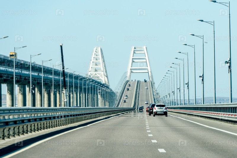 Россия, Крым, 11 сентября 2019 г.: Дорога в Крым через Крымский мост. Вид из окна автомобиля