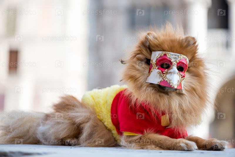 Маленькая пушистая собачка в маскарадной маске надела намордник