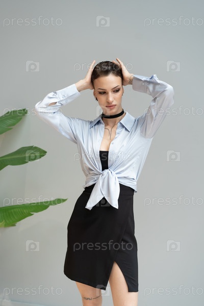 Молодая красивая женщина позирует в черном платье в студии