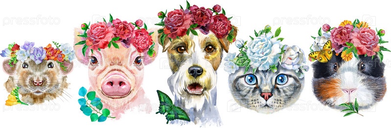 Граница с домашними животными. Ручная роспись акварелью, изолировать клип-арт на белом фоне. Дизайн баннера