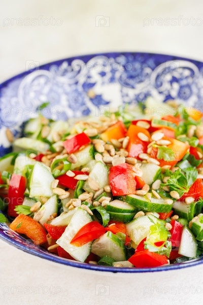 Веганский овощной салат с семенами в синей винтажной тарелке на столе в солнечный день