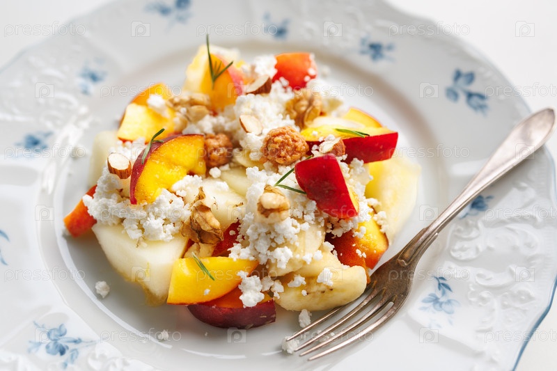 Фруктовый салат из персика, дынного творога и орехов на белом фоне. Диетическое натуральное питание. Естественный свет