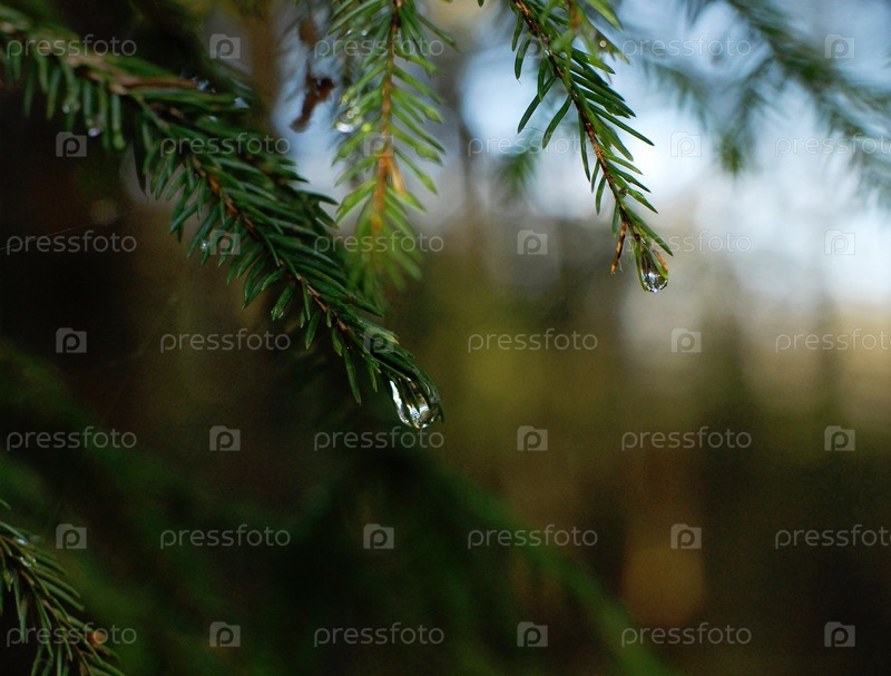 Капля дождя на ветке ели